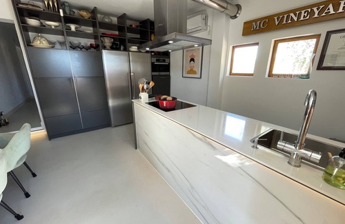 Unique is the fully equipped garden kitchen, a dream come true for anyone who loves to cook. Complete with a BBQ, grill, fridge and dishwasher. Whether you're grilling fresh local food or prepping tapas under the stars, this kitchen is a culinary playground.
