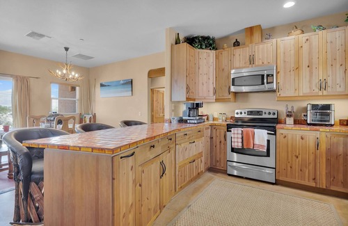 This newer built desert home has been very well maintained. The spacious layout of the home features high ceilings with an open concept living room/kitchen. For privacy, the main bedroom with king sized bed and en suite bathroom is located on one side of the home. 2 smaller bedrooms with queen sized beds are on the other side of the home. The beds feature hotel quality linens and cotton towels in the bathrooms. If workspace is needed, a desk with printer is located in one of the bedrooms along with WiFi that works throughout the house. In the living room there is a 50" TV with Dish Network. If you choose not to dine out, the kitchen is equipped with stainless steel appliances and stocked with pots & pans, a rice cooker, pressure cooker, air fryer, toaster, blender, etc. There is also a BBQ for grilling and Keurig coffee maker.
