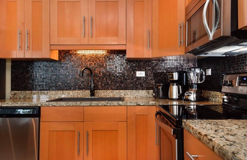 -Fully loaded kitchen with appliances including Blender, Stove, Refrigerator, Coffee maker, Microwave, Dishwasher, Oven, Water Dispenser