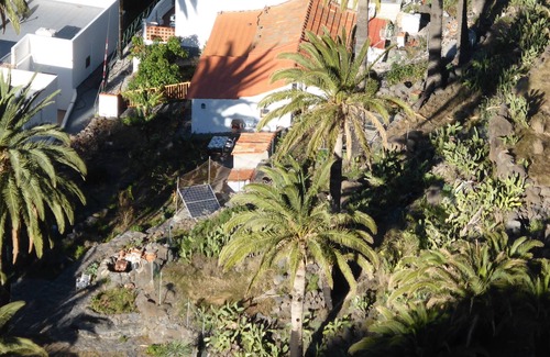 The cottage is situated at the very edge of Chele, right on the eastern side of the mountain, in the middle of Valle Gran Rey, away from the main road. Earlier this wine was made, now the owner of Lucas and Lucia have there hingebaut a small house, which is on the edge of a very large terraced garden with palm trees and vines, native fruit trees (oranges, lemons, loquat), coffee shrubs, herbs and vegetables.