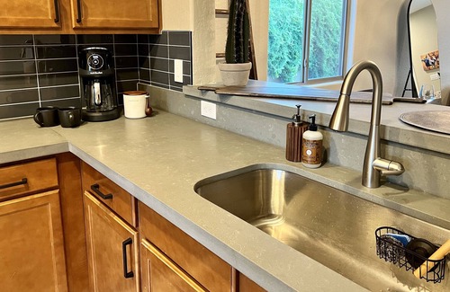 You will also find a gorgeous newly remodeled kitchen that opens up to the living room where you can serve up a mouth watering meal while also streaming your favorite channel on the smart flat screen TV! Our large kitchen offers plenty of space to cook up a meal with a large oven, microwave, cooking utensils, bountiful countertop space and farmhouse sink! Our guests are also welcome to use all of the stocked spices and cooking supplies found inside of the cabinets.