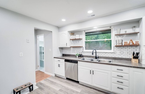 The completely remodeled kitchen is equipped with state-of-the-art appliances and features sleek countertops and cabinetry. It includes everything needed for culinary exploration, from a modern stove and microwave to a dishwasher for easy cleanup. The kitchen also boasts a large pantry, providing ample storage for all your cooking essentials. Guests have access to a full array of cooking tools including pans, pots, a slow cooker, and various utensils, ensuring that any meal, whether simple or elaborate, can be prepared with ease. Adjacent to the dining area, which features a charming Mable top table set for 6-8, there is a bar that offers additional seating. While the bar provides a stylish space for casual meals or socializing, please note that drinks are not provided, encouraging guests to bring their favorite beverages to enjoy during their stay.