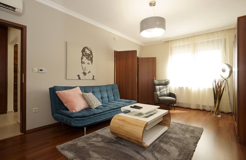 The apartment house is located in the heart of Kecskemét, in a quiet, park environment, where relaxation is provided by our spacious, comfortable apartment which satisfy all desires. The main square of Kecskemét is a 2-minute walk away. Size of apartment is 55 m2, which includes the following rooms: an American-kitchen and living-room, a bedroom, a bathroom with bath an a seperate toilet. All rooms have air conditioning. The kitchen is fully mechanized and equipped. TV with satellite channels in the living-room, WI-FI connection throughout the apartment. You can park in the closed yard free of charge.