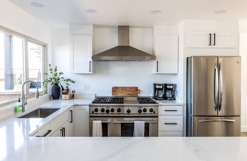 Kitchen: Full Kitchen, completely stocked with cookware, spices, 2 coffee makers, blender, toaster, toaster oven, bottled water dispenser, and a full-sized stainless steel fridge and freezer, Dishwasher, 6 Burner-48" Stove.