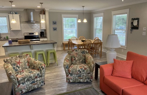 Center of Emerald Isle, private beach parking lot! The beach access is just over a block from Bogue Inlet Pier where there are public restrooms, shopping, a restaurant and great fishing! Very short walk or drive to the private beachfront parking in gated lot with showers onsite at the access. The access fob used for the gated lot is provided with the home. Very short walk to “downtown Emerald Isle” where there are shops, restaurants and nightlife. 3 minute walk to Cedar Street pier on the sound. Linens provided, including bath & beach towels, washcloths and kitchen towels. Charcoal grill and picnic table onsite. Large outdoor shower beside the home. Large driveway for boats and multiple vehicles. Quiet, dead end street, open floor plan, king in master and queens in 2nd & 3rd bedrooms. Pullout sofa in living room. 500 mbps Internet - Spectrum Ultra package! Dish and hand soaps are provided. First couple of trash bags are provided.