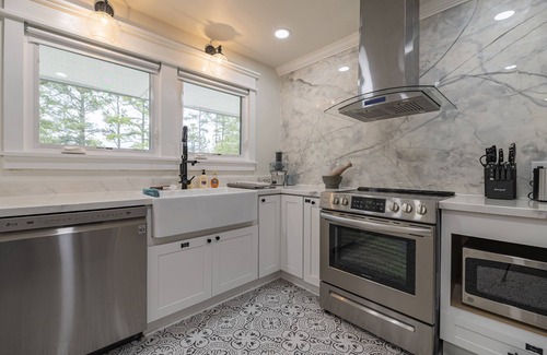 Your home stay is designed for comfort with an open floor plan and oak hardwood floors, newly tiled bathrooms, and stylish LVP in the kitchen and laundry areas for easy cleanups. The kitchen is fully-equipped for all your cooking needs. It includes a great selection of pots, pans, baking pans as well as seasonings and spices. All-new stainless steel appliances, beautiful epoxy counter tops, coffee nook/bar. The dining room is perfect for inviting guests to share a meal or for a romantic dinner for two.