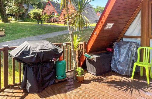 Separate Toilet.. Oil central heating, electricity, bed linen, towels and Wi-Fi included. Travel cot, highchair and stairgate. Welcome pack. Back decking with sitting out area. Front gated decking with garden furniture and gas barbecue. Indoor heated pool (shared with other properties on-site, 17.5m x 10m, depth 1m x 1.9m, 09:00 - 17:00) with shower facilities and changing facilities. Private parking. No smoking. Please note: There are 4 steps within the back decking. Welcome pack.. Nestled within the serene landscape of Kingsdown Holiday Park, Chalet 47 By The Sea beckons with its charming timber A-frame architecture and breath-taking sea views.