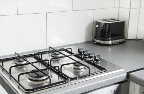 The kitchen has a fridge, a hob, an oven, a toaster, a kettle, a coffee maker, a freezer and a microwave.