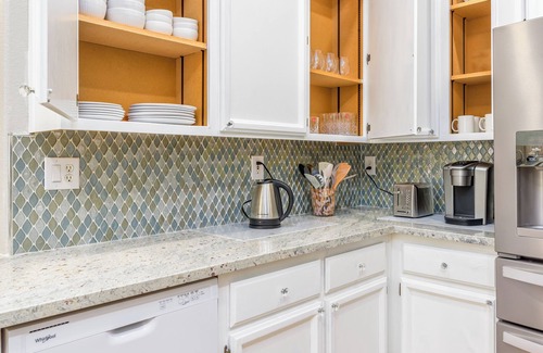 - Kitchen: Coffee maker, K-cup coffee machine, toaster, oven, microwave, fridge, dishwasher, cookware, dishes, glassware, utensils, oil, salts, and peppers.