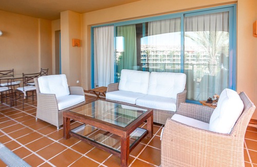 Luxury apartment, La Marina Sotogrande. Spacious and bright, 130m2, magnificent views of the canals. fitted wardrobes and 2 full bathrooms. Master bedroom suite. Kitchen fully equiped. All exterior. Crockery, glassware, cutlery, quality home clothes. Living room with fireplace. Beautiful covered terrace, chill out and summer dining room, south facing. 2nd floor, elevator and access from garage. AC and heating in all rooms. Wifi. High qualities Ideal families.