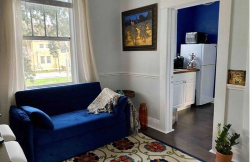 The guesthouse offers a cozy oasis with 2 queen size memory foam mattresses, blackout curtains for a restful night's sleep.The apartment has an eclectic fully stocked kitchen, a beautifully renovated bathroom, high-speed WIFI and a Smart TV.