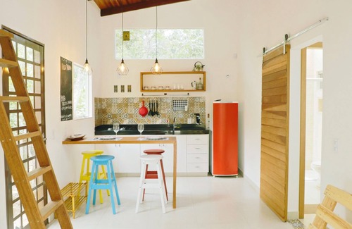The kitchen where you prepare your food is colorful, bringing lightness and joy to those who cook, after all the food we eat brings energy to the body and soul, nothing better than the inspiration that this kitchen brings. Wooden counter, fridge, colorful dishes, glasses, wine glass, utensils, cutlery, blender, sandwich maker and Italian coffee maker.