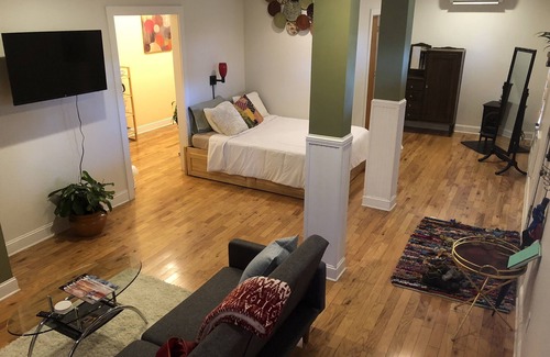Experience the convenience of this private studio and balcony overlooking the heart of beautiful Asheville, NC. Parking in the city can be tough but stay here and you can walk or bike to it all! Famous Pack Square, iconic French Broad Chocolate Lounge amongst many other breweries, restaraunts and coffee houses are a 5-10 minute walk. Great studio space with lots of amenities. Family Friendly.