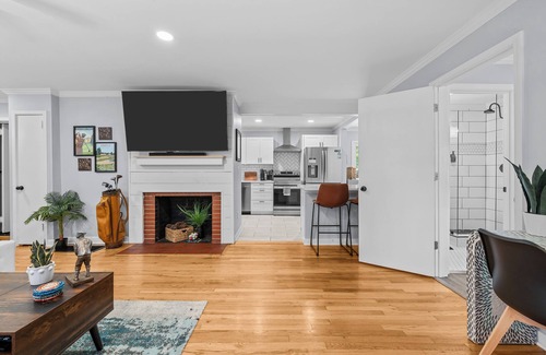 This recently renovated 1950s home may look tiny on the outside but is surprisingly open and spacious the moment you step inside! You'll experience the perfect mix of old cottage charm blended with bright, modern, industrial features and touches of relaxation and comfort. With 3 bedrooms and 2 full baths, you'll have ample space to settle in and unwind. Kick back in front of the 70inch smart TV or cook to your heart's desire in the fully equipped kitchen. Need to do laundry? No worries! There is a full-size washer and dryer! Enjoy meals for parties up to 6 at the dining table or picnic table.