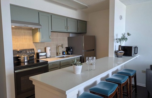 Step inside and unwind in the thoughtfully designed living space featuring a comfortable bed, modern décor, and a soothing atmosphere. The condo is equipped with heating and air conditioning to keep you comfortable in every season, along with high-speed Wi-Fi and a flat-screen TV for your entertainment.