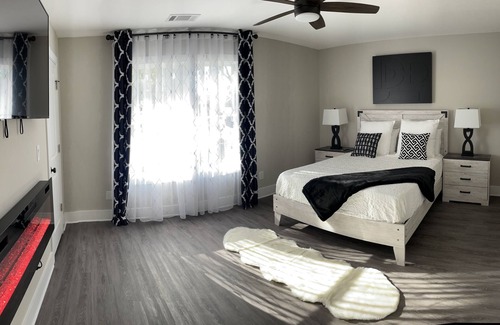 Enjoy a stylish, experience at this centrally-located romantic, cozy townhouse, with fireplace, 65inch TVs, masage chair and more.