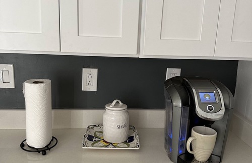 Kitchen: Completely remodeled with stainless appliances, cookware, Keurig coffee maker, dishwasher, flatware, bar cart, microwave, linens, paper towels, dish soap, hand soap