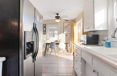 setting with comfortable bedding and sheets, and thoughtful furnishings. Our home is equipped with fast wifi , fully equipped kitchen and an easy smart lock. Tastefully decorated, tidy, uncomplicated, and cozy.