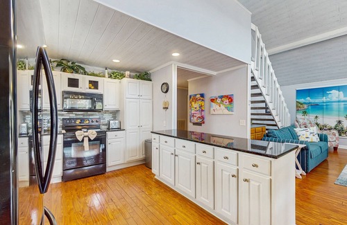 Step into contemporary and carefree charm upon entry, natural light flooding throughout the space. Relax and make yourself at home by marveling at the beautiful decor, resting on the plush furniture while curling up with a good book, or watching your favorite shows on the large TV in the living area. Hobby chefs will love preparing grand meals and beach picnic snacks in the sophisticated galley-style kitchen, equipped with updated appliances and plenty of cupboard room. Comfortable beds in spacious bedrooms ensure that everyone will receive a restful night's sleep from the day's adventures. Find the epitome of comfort in the main bedroom, which boasts a TV for private viewing and a lovely en suite bathroom complete with a walk-in shower. Downstairs, discover a true Indoor-Outdoor Living Experience—perfect for entertaining or unwinding. This level features a screened-in porch with a relaxing hot tub and multiple dining areas, ideal for enjoying meals al fresco. A well-appointed kitchenette includes a full-size refrigerator, microwave, electric grill, and pizza oven. You’ll also find a cozy lounging area with game tables, two TVs, and more for endless fun. A full bathroom with a tub and shower adds convenience to this versatile space.