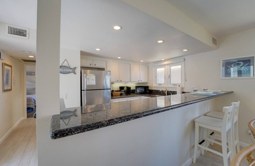 The first level, just a short staircase up from the front entry, features an open floor plan living room, dining room, and kitchen with bar seating—a great space to share! The outside balcony, accessible from the kitchen and dining area, includes a propane gas grill for convenient dinner grilling. While the unit is not directly on the bay, you can catch a glimpse of the water by peeking out the side balcony. The kitchen is fully stocked for meal prep, dining, and entertaining. The living room is equipped with a smart TV and live TV. On this level, you`ll also find a washer and dryer tucked away in a closet, along with a full guest bathroom and guest bedroom. This bedroom has a new cozy queen size bed, mirrored closet, and smart TV. The main level has central AC and the master level has a window unit.
