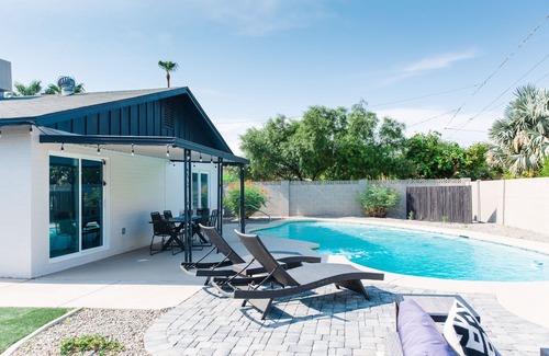 Beautiful 3 bedroom 2 bath modern home in Old Town Scottsdale. There is a master suite and then two other spacious bedrooms that each sleep 4 comfortably. There is large great room off the kitchen with a 65" smartTV. The dining area is furnished with an oversized custom made table that offers seating for ten plus a large island with seating for 5! The Kitchen is so fresh beautiful and is fully stocked with everything you will need to prepare meals. The backyard is huge and features a nice sized patio area and large grassy area with paver patio extension w/more chairs, gas BBQ, outdoor table and chairs, and pool with lounge chairs! The home also has WiFi, Youtube TV, TV's w/smart blu ray players for Netflix/Hulu, 1 pack-n-play and more. Located in a prime area of Scottsdale close to the 101 freeway, Talking Stick Resort/Casino, Odysea aquarium (largest aquarium in the southwest) and the center of Old Town Scottsdale. There are tons of great restaurants, bars, hiking, shopping, and golfing. This place has it all!