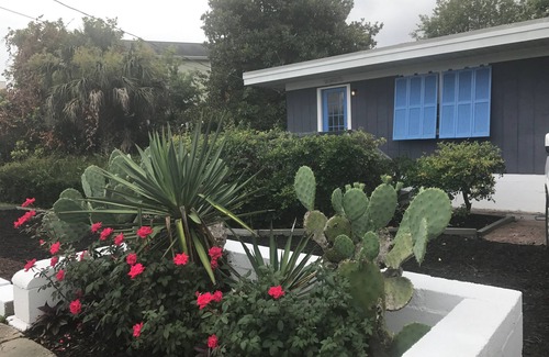 Charming & unique, 2 levels, but very gradual incline with no scary stilts to sway the home in the beach breezes. Free parking for up to three regular-sized cars or SUVs, Bahamian shutters and buoys, shady back patio seating. The perfect setting to make memories, take pictures and reconnect with family and friends! No large groups. Grill outside, stroll the beach, enjoy sports, family time or nearby fireworks by night. Plus, a couple of small parks within one block--there is a children's beachside playground/pirate ship, exercise course (parcours) and dog-walking areas abound-- all are closeby without cost.