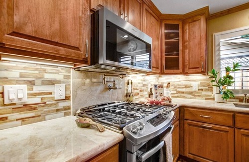 The kitchen is a culinary haven with high-end features, including a pot filler faucet, 5-burner gas stove, Bluetooth-enabled microwave, and double convection oven. Additional conveniences, such as a countertop air fryer, toaster oven, and Cuisinart grind-and-brew coffee maker, make every meal a delight.