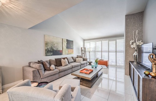 This peaceful midcentury modern gated townhome is located just minutes away from the Las Vegas strip and Harry Reid airport. The grounds include beautiful mature landscaping 2 pools and 2 hot tubs.The interior offers two private outdoor spaces with mountain views, washer and dryer. Wifi, and a fully stocked kitchen with dishwasher, microwave, stove.