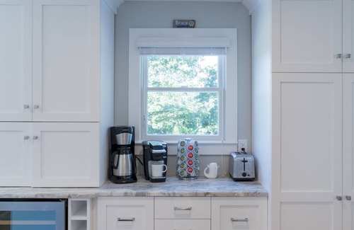 There are three master suites. The first bedroom is located off the main living room and features a king-sized bed, half vaulted ceilings, and private master suite bath. There is also a private sitting area in the back yard located just off the hallway to the master suite. The newest addition to the home has first-floor master suite with a king bed & twin trundle bed in a bonus room. Upstairs is a large master suite with a couch & Juliet Deck overlooking the back yard. A large bath with a skylight shower gives you the feel of a sun-drenched outdoor shower. There is also a large walk-in closet that can be used as a home office if you need to have a working vacation.