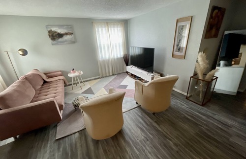 Relax on a nice sofa and 2 Vintage chairs in this spacious living room and take full advantage of the 58” smart TV, complete with streaming services.