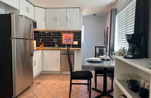 The fully equipped casita has one bedroom, living room, kitchen, dinette, full bathroom and laundry room. Recently renovated, the warm and cozy casita has a new kitchen equipped with an induction cooktop, microwave, dishwasher, full-size refrigerator with an ice maker. The casita is focused on functionality, with a fresh perspective of clean lines, natural materials, abundance of natural light and accented with hughes of charcoal grey, deep blues and golds.
