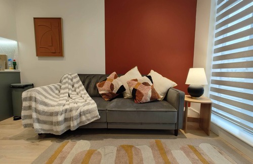 The apartment features a fully equipped kitchen, a cozy living area, & a plush bedroom that comfortably sleeps up to three guests. Enjoy high-speed Wi-Fi, a smart TV, and complimentary parking in a secure building.