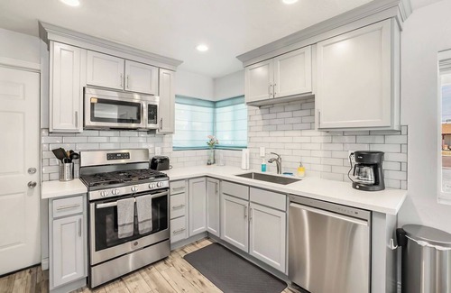 Soak up the sun in the charming outdoor space, complete with a fire pit, outdoor dining table, chairs for 6, and a gas BBQ. Please note that a separate, self-contained home is located behind this property, with a shared trash area and entry gate. Looking for additional space? Ask us about our combo listing, which features a separate home on the same property that sleeps an additional 4 guests!