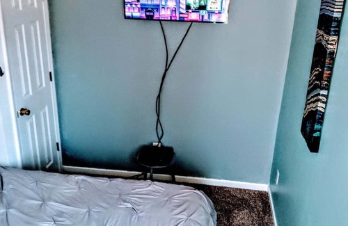 Upstairs of the home completely private from entertainment quarters downstairs, with a door at the top of the steps for privacy. Private bedroom with Queen bed, facing backyard. Bonus room with twin daybed with trundle (2 single beds) , overlooking backyard. Two street view bedrooms; one queen bedroom, and one bedroom with 2 twin beds. One spacious half bath on the bottom floor, full bathroom on top floor.