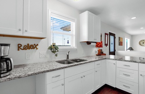 Step inside and you’ll find a bright, open-concept living area featuring a plush sectional sofa, an oversized ottoman, two cozy chairs, and a streaming TV—perfect for movie nights or lazy afternoons. The adjoining kitchen is fully equipped with an electric range, microwave, drip coffee maker, refrigerator, and beautiful granite countertops. Crisp white shaker cabinets and ample counter space, including a bar with seating for three, make cooking and gathering a breeze.