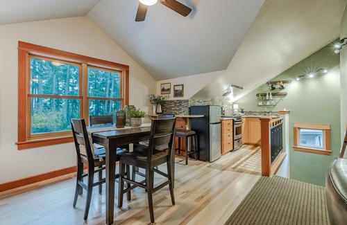 This fully furnished apartment is a spacious one bedroom, one bath located over a detached garage. Our property is forested with Spencer Butte views, minutes from downtown Eugene. The main house is just steps from the apartment, if you have questions or need assistance. The apartment features a gourmet kitchen with an apartment size refrigerator/freezer and glass top range, hardwood floors and a heat pump for year around comfort.