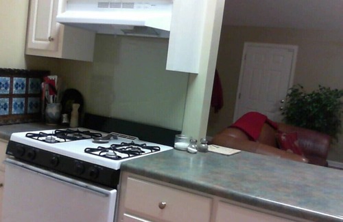 Both bedrooms have a king bed. One room also has a twin. Each bedroom has a full bathroom. Linens provided. Kitchen is well-stocked. Comfortable seating area with large TV and DVD player and Internet cable TV & WiFi. Large table for six in common area. Private backyard with grill and patio. One story, no steps. Washer/Dryer.