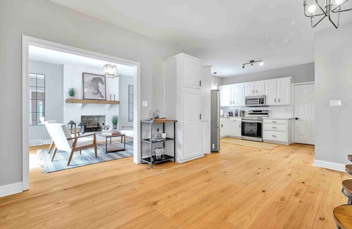 The fully stocked kitchen makes dining easy, and a large dining table seats up to 12 guests comfortably, with an additional bar area that includes 4 stools. A coffee station is provided with both a standard coffee maker and a Keurig, along with grounds, pods, flavor syrups, creamers, and filtered water. A laundry space with washer/dryer, iron, and steamer is also available. Guests will also find hair dryers, toiletries, and even travel amenities like toothbrushes and shaving kits. Enjoy board games indoors or step outside to the furnished patio with fire pit, Adirondack chairs, grill, and yard games.