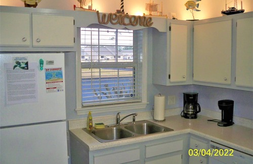 Located in a quiet community with views of pine trees and ponds. Easy access to shopping, restaurants and entertainment. Close to the beach but far enough away to avoid the beach traffic if desired. Two master bedrooms with their own bathrooms are located upstairs with a half bath on the first floor. All bathrooms have new marble countertops. All flooring is luxury vinyl tile with area rugs in the bedrooms and living room. The fully furnished kitchen also includes a refinished countertop and above cabinet lighting. Enjoy interior furnishings like a recliner sofa and loveseat, beautifully hand painted dining table and chairs and beach theme decorations. Outside touches include hooks to hang wet towels, patio table and chairs with a huge umbrella and a grill. All linens and dishes are provided so just come, unpack and enjoy a beautiful sunset. We also have another unit nearby so if you have a large family or extra friends please contact us about renting both units. Located between Morehead City and Jacksonville and close to Camp Lejeune Marine Corp Base.