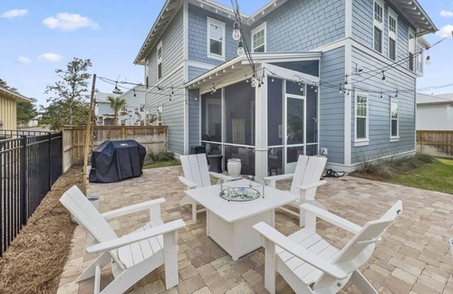 Step inside and be greeted by an open-concept living area, curated with upscale coastal furnishings, elegant finishes, and an abundance of natural light that instantly makes you feel at home. The kitchen is fully equipped with top-of-the-line appliances, a spacious island for entertaining, and everything you need to craft unforgettable meals with loved ones. Whether you're gathering for a family breakfast or an evening cocktail hour, the seamless flow between the kitchen, dining, and living spaces ensures every moment is shared in comfort and style. Mornings are best spent savoring a cup of coffee on the serene screened-in porch, surrounded by the soft sounds of nature and Gulf breezes. As the sun sets, gather around the outdoor fire pit for evenings filled with conversation, laughter, and a touch of coastal magic.