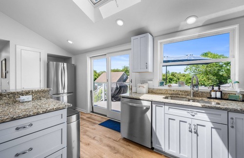 Step inside and discover a beautifully renovated interior where coastal style meets contemporary comfort. The fully equipped kitchen features granite countertops, stainless steel appliances, a vaulted ceiling with skylight, and a large peninsula with bar seating for eight, ideal for group gatherings. Adjacent to the kitchen is a light-filled dining area and a cozy living room with a wall-mounted smart TV for winding down after a full day.