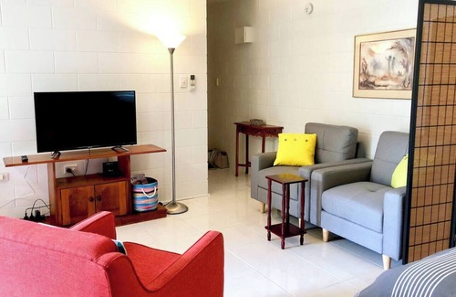 Surrounded by sub-tropical landscape, step into this stylish studio apartment tucked away on a quiet side street in Edge Hill. Enjoy a snug living area with arm chairs arranged in front of a flatscreen TV.
