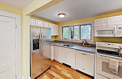 The updated kitchen features sparkling granite countertops, quality appliances, and ample cabinet space. When it’s time to eat, gather around the dining table with seating for four.
