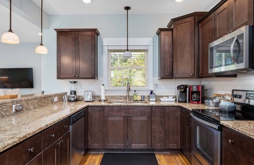 The second level includes a well-stocked kitchen for the chef of the family to prepare your favorite meal. The open floor plan allows everyone to enjoy the great room, dining area, and kitchen while exchanging stories of their day's activities and plans to return for another memorable vacation at Colin's Cabin.