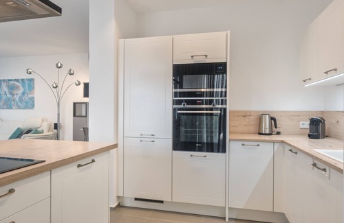 The open kitchen, with induction hob, is equipped with refrigerator, microwave, oven, freezer, washing machine, dryer, dishwasher, dishes/cutlery, kitchen utensils, coffee machine, toaster, kettle, and juicer, ....