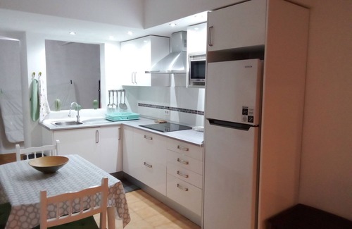 On the lower floor we have a laundry room with luggage storage shelves, 6 kg washing machine and cleaning utensils, including washing machine soap; the fully equipped kitchen-dining room including barbecue utensils with enough utensils for four people, toaster, Italian coffee maker with ground coffee and filter coffee maker with filters included, mixer, juicer, 2 salad bowl, 4 kettles, 2 pans, a grill and crockery for 4; a cute toilet; fan and air conditioning; a comfortable living room with a comfortable 4-seater sofa bed, two individual armchairs and 31´ Samsung TV with Movistar, a cabinet with drawers, a living room table, a lamp and the main entrance to the terrace