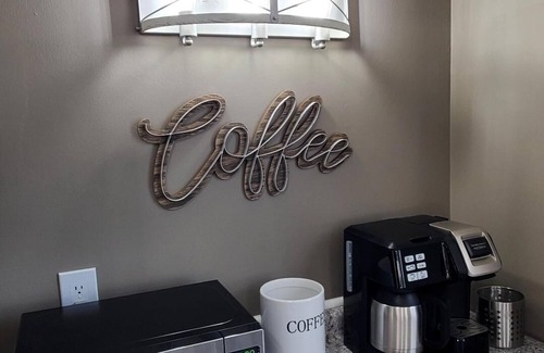 The fully-equipped farmhouse kitchen design features brand new, stainless-steel appliances, including a dishwasher, a custom coffee corner, with a K-cup/coffee pot combination, electric can opener, cookware, food storage options, barware, dishes and flatware for 12 and more!