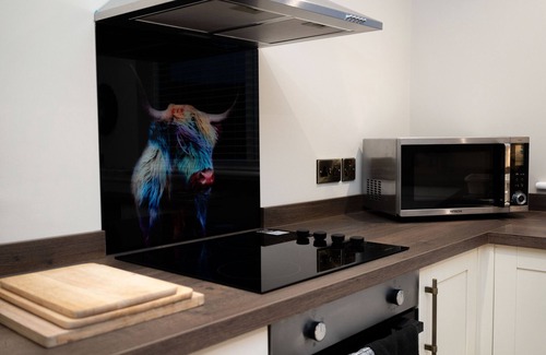 A fully equipped kitchen, including utensils, hob, oven, microwave, slow cooker and more, suited to all your culinary needs. Plenty of cupboard space and complementary tea, coffee, sugar and oil available.