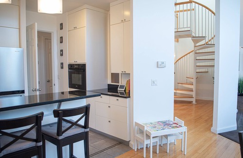 There is a well-equipped kitchen with coffee station and bar seating as well as a small library that can be used as a work area.