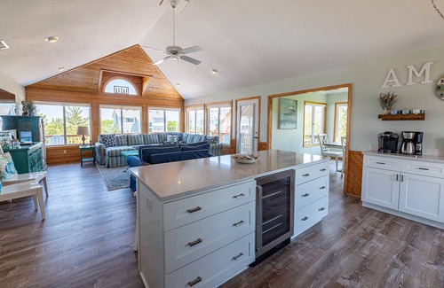Upper Level: Great Room w/TV/DVD, Dining Area w/8 Chairs (seating expanded to 10 w/leaf), Kitchen Bar w/4 Bar seats, Coffee Bar / Wine Bar, Kitchen is fully stocked, Powder Room, Bathroom with Tub, Awesome views from almost every window, Adirondack Chairs and Porch Furniture, Direct Beach Access across the street.